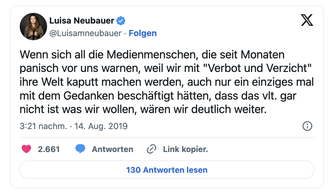 Auf der Mailingliste der Scientists4Future in Berlin/Brandenburg und auch unter den Aktiven von climatewednesday.org kommt immer wieder die Frage auf, ob es um Verzicht oder um politische Änderungen geht. Luisa Neubauer (die Hauptorganisatorin beim deutschen FridaysForFuture) schreibt auf twitter: