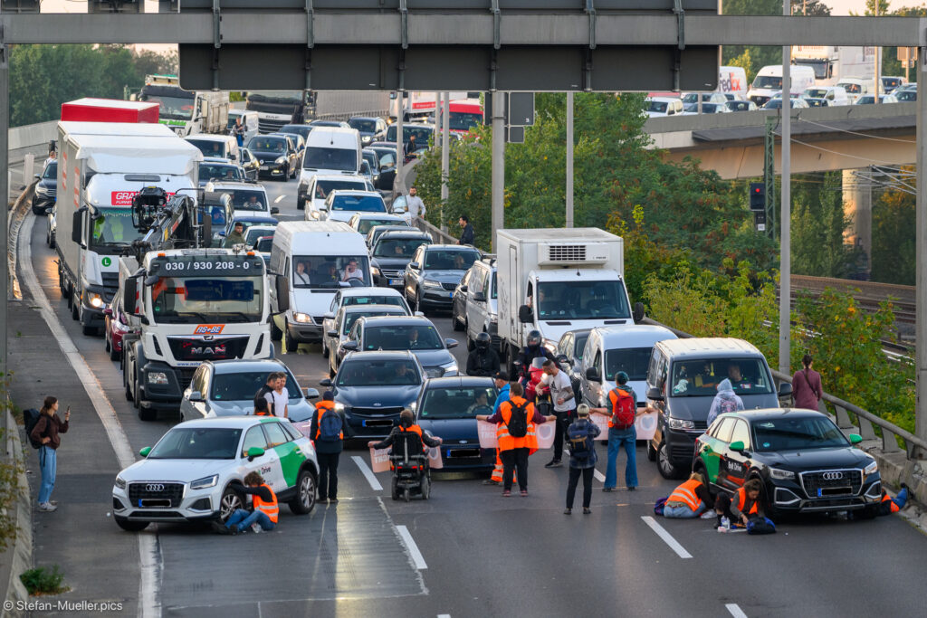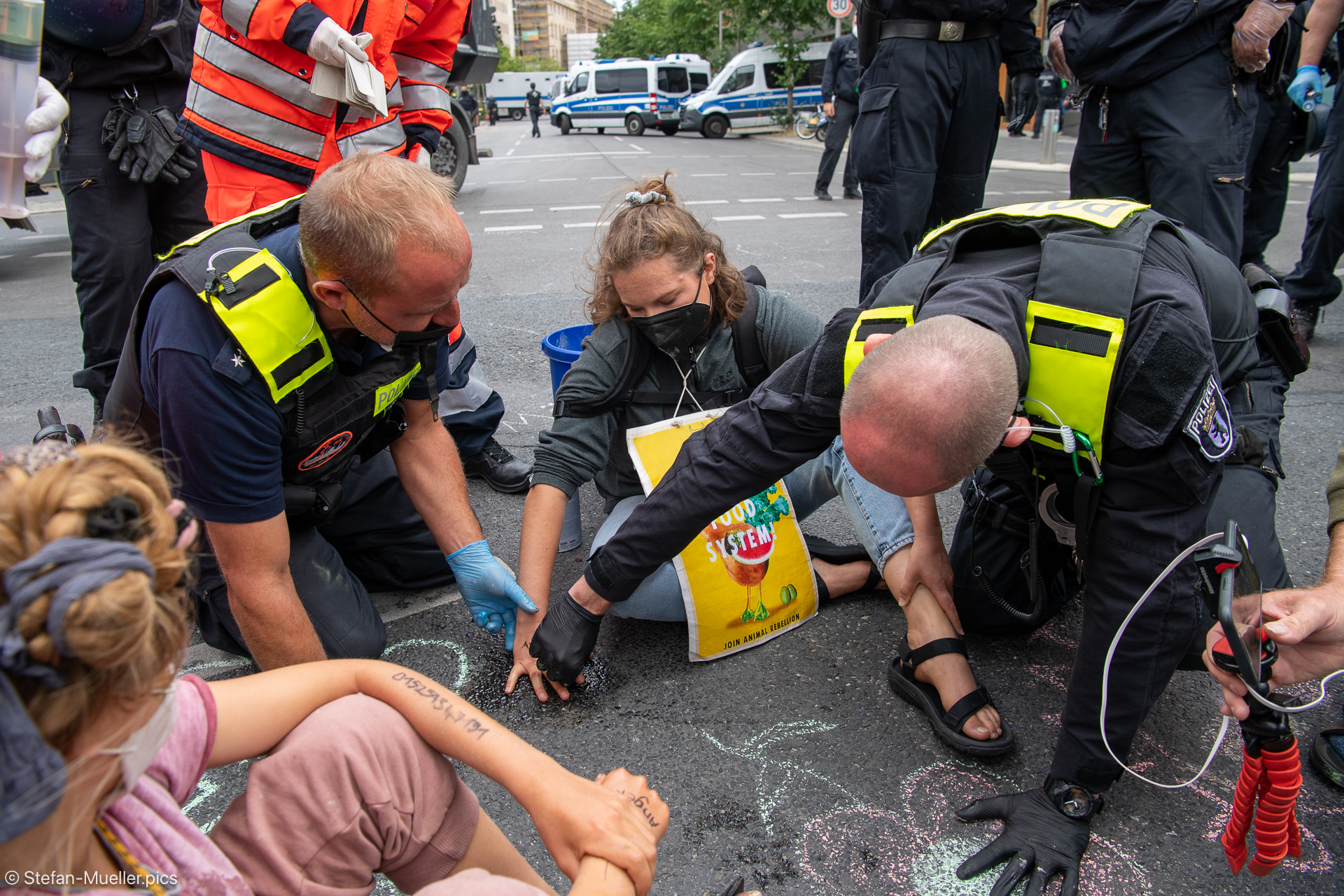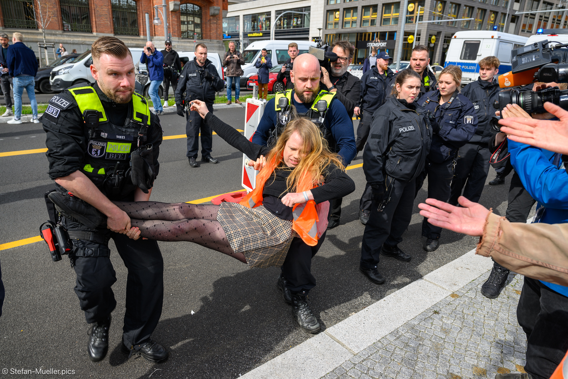Jedoch gab es eine gemeinsame Blockade mit XR und anderen. Nach einem Protestmarsch von FFF sind Aktivist*innen verschiedener Klimagruppen zurückgekommen und haben vor der SPD-Parteizentrale die Straße blockiert. Carla Reemtsma und Pauline Brünger haben für FFF gesprochen. Man beachte die Traktoren!